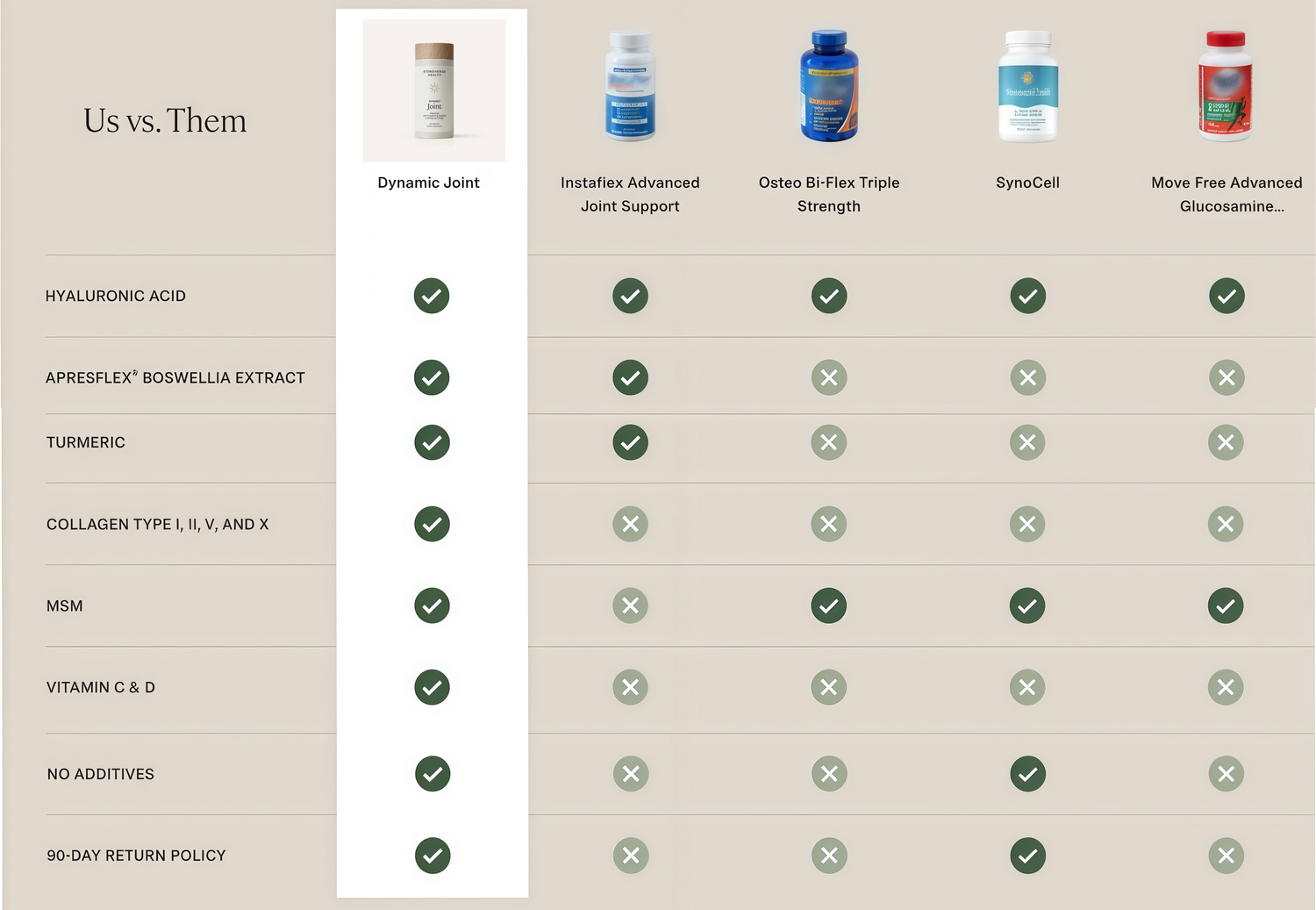 Joint health formulas sold in stores and online are not all the same. Many supplement manufacturers attempt to reduce their costs and cut corners by not including the optimal dosages and purity of ingredients that we do at Stonehenge Health. Dynamic Joint combines AprèsFlex® with MSM, which most on the market do not.